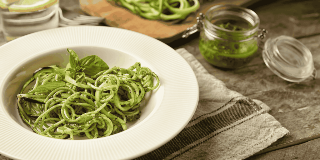 - Misture: aqueça rapidamente o “espaguete” de abobrinha em uma frigideira (apenas 1-2 minutos, para não soltar água) e envolva no pesto.