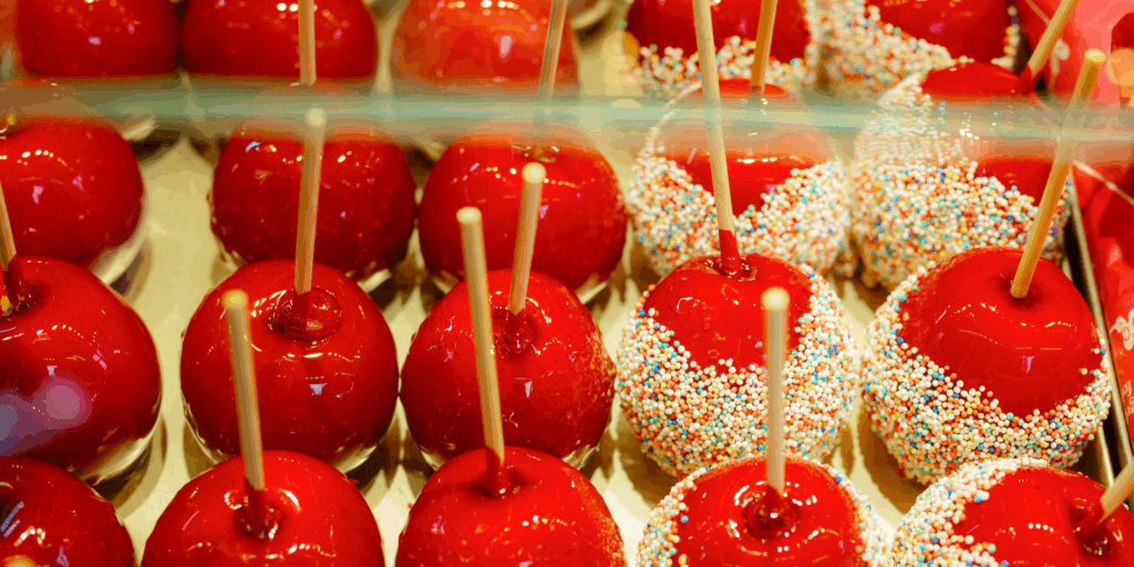- Mini Maçãs do Amor: ideais para festas infantis, feitas com maçãs pequenas ou cortadas em pedaços no palito