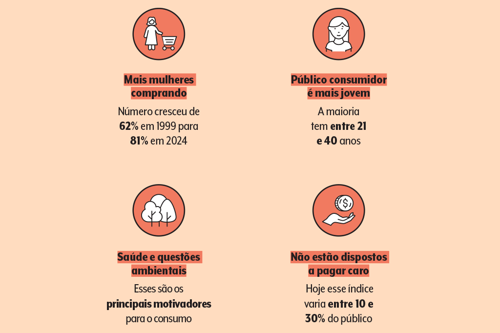 O resultado mostra que mulheres e jovens são hoje os principais compradores. A motivação número um é clara: cuidar da saúde. Por outro lado, o preço continua sendo o maior desafio — alguns produtos chegam a custar até cinco vezes mais que os equivalentes convencionais, especialmente frutas.